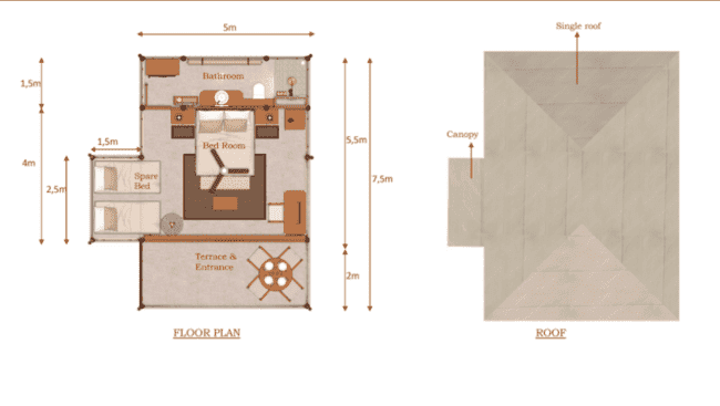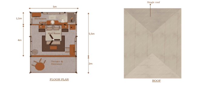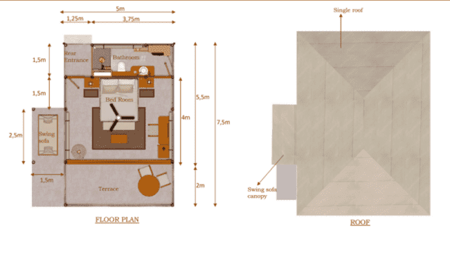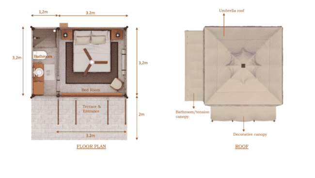 Sizes range from 2.5 m x 2.5 m to 10 m x 15 m, based on a 2.5-meter grid, offering flexibility for various needs. Our expert team of architects and interior designers, with years of experience in creating unique spaces, is dedicated to integrating the beauty of nature with the comfort of luxury. Each Tent layout is thoughtfully designed based on the structure’s purpose, its size, and your personal preferences. Whether you’re seeking a cozy retreat or a larger space, we can craft a layout that perfectly aligns with your vision.